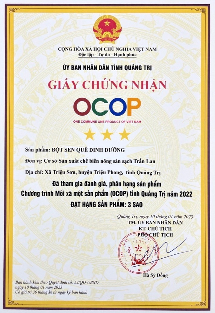 Từ những hạt sen tươi được thu hoạch tại vùng quê Triệu Sơn – Quảng Trị, sản phẩm Bột sen quê dinh dưỡng Trần Lan được chế biến theo quy trình khép kín, giữ nguyên vị ngọt bùi tự nhiên, không chất bảo quản, không hương liệu, không đường tinh luyện.