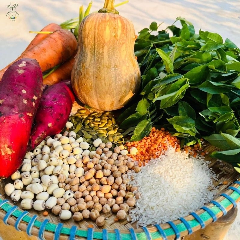 Rau củ (65%); bí đỏ khoai lang, hạt sen, rau ngót, cà rốt, ngũ cốc (35%), gạo tẻ, đậu gà, đậu lăng.